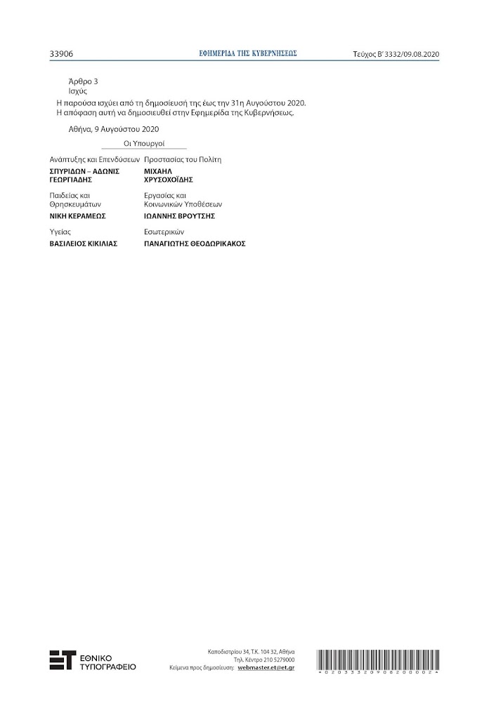 Παρατίθεται παρακάτω αυτούσια η Κοινή Υπουργική Απόφαση με αριθμό Αριθμ. Δ1α/Γ.Π.οικ. 50451, όπως δημοσιεύθηκε στο ΦΕΚ 3332/Β/09-08-2020, με θέμα «Αναστολή θρησκευτικών τελετών που πραγματοποιούνται μέσω της διενέργειας πομπής, προς περιορισμό της διασποράς του κορωνοϊού COVID-19».
